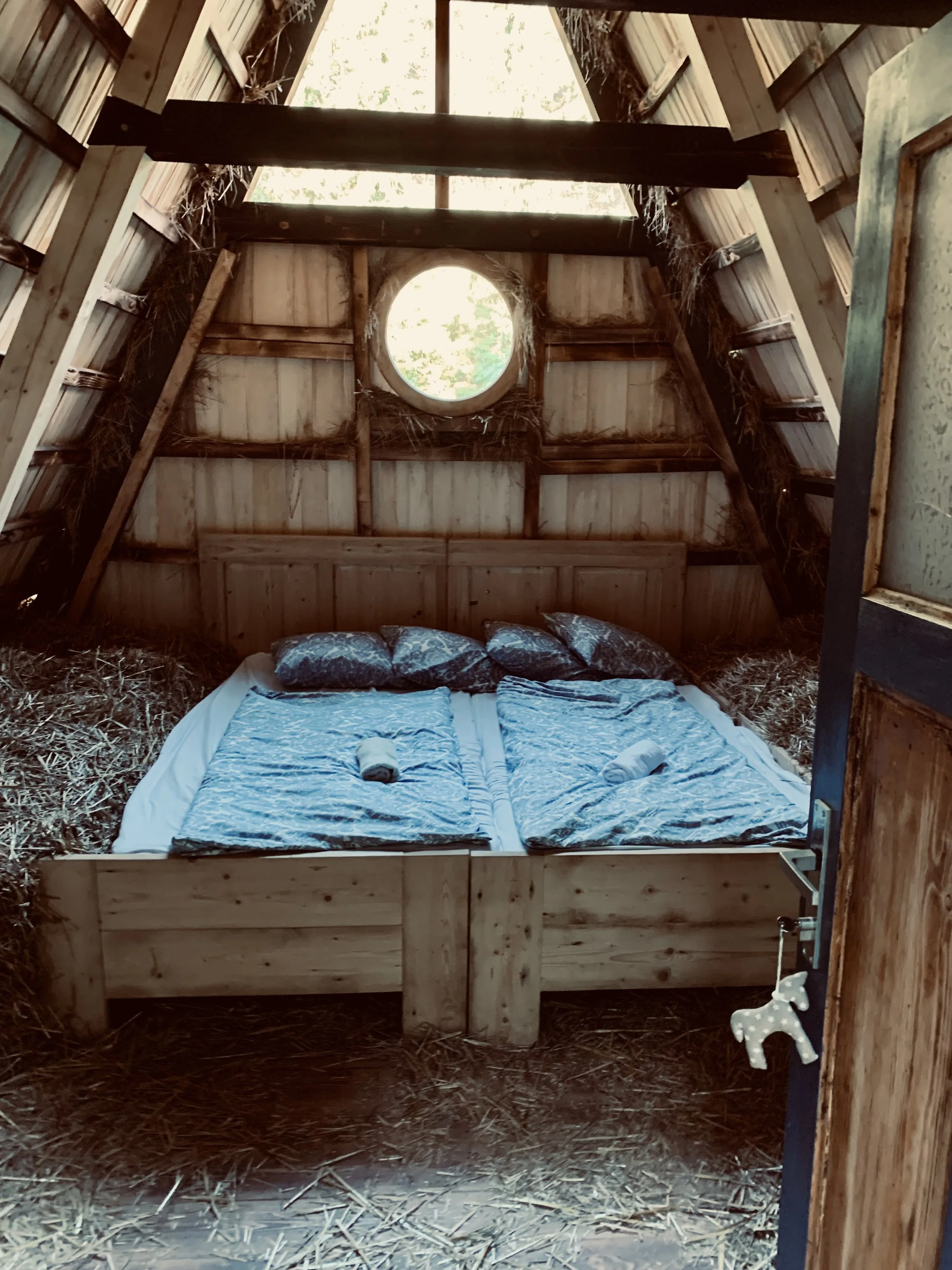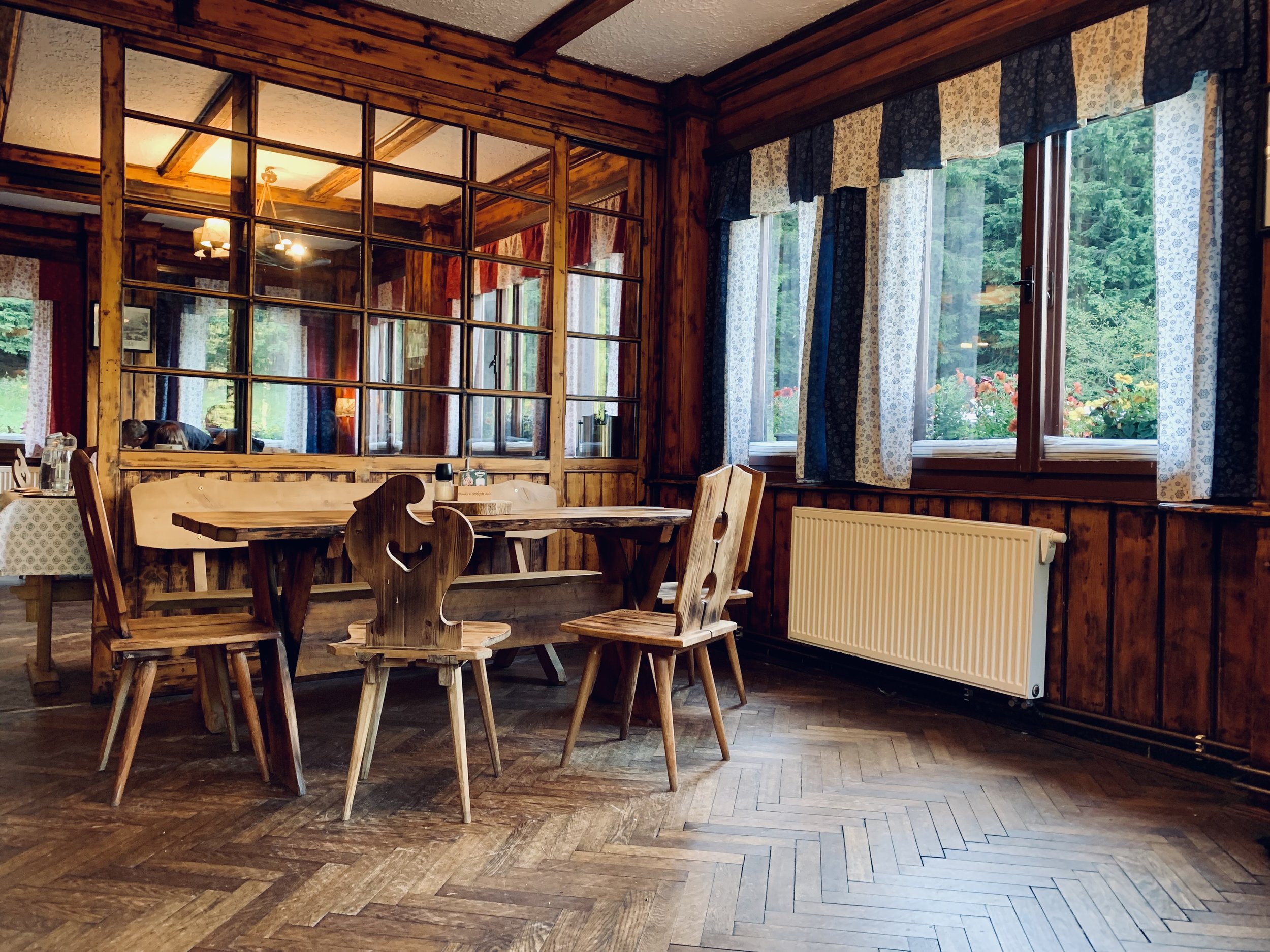 Het hotel, wat geheel berghut-achtig aanvoelt, heeft een heerlijk terras met mooi uitzicht over de bergen. En lekker bier (op z’n Tsjechisch gelijk een halve liter voor nog geen 2 euro). De berghut heeft meerdere simpele maar prima kamers, maar ook iets wat heet de ‘Sherpard’s Hut’. Dit is een kleine cabin die ook als hooi opslag dient. Het bed staat dan ook tussen de hooibalen - wat een interessante (zeker unieke) ervaring is voor een nachtje. Het eten is prima, het ontbijt top, en het personeel ontzettend vriendelijk!